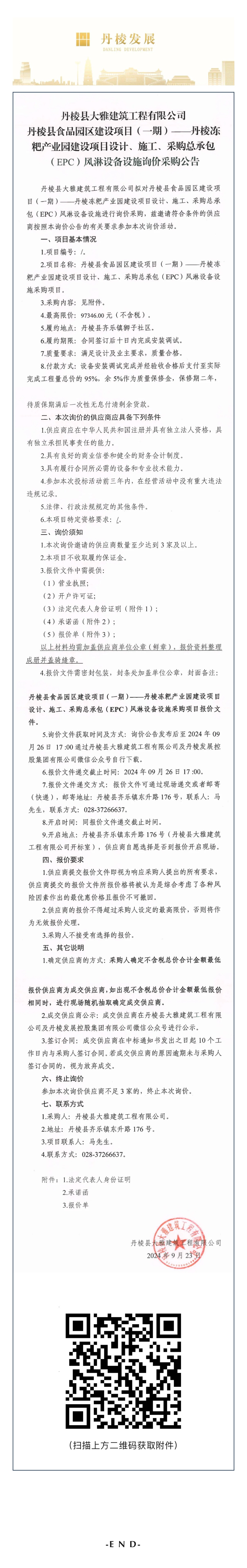 縣大雅建筑公司丹棱縣食品園區建設項目(一期)—丹棱凍粑產業園建設項目設計、施工、采購總承包(EPC)風淋設備設施詢價采購公告