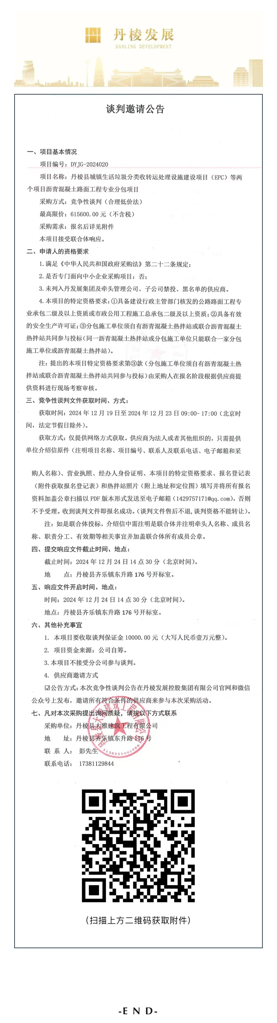 丹棱縣城鎮生活垃圾分類收轉運處理設施建設項目(EPC)等兩個項目瀝青混凝土路面工程專業分包項目談判邀請公告