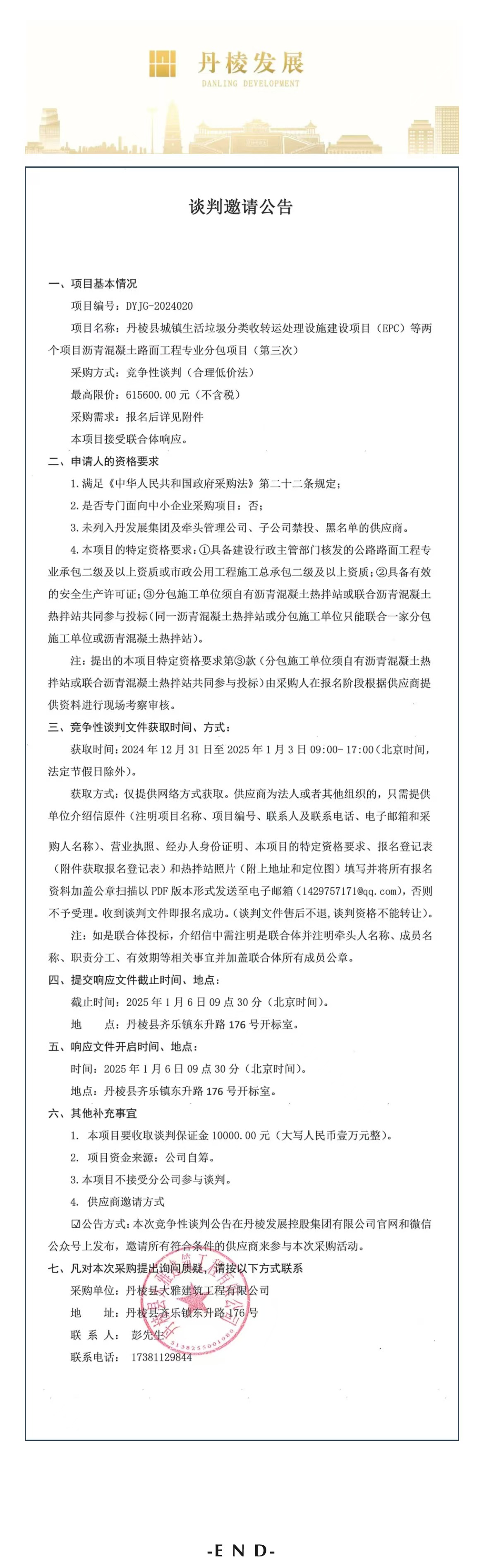 丹棱縣城鎮生活垃圾分類收轉運處理設施建設項目(EPC)等兩個項目瀝青混凝土路面工程專業分包項目(第三次)談判邀請公告