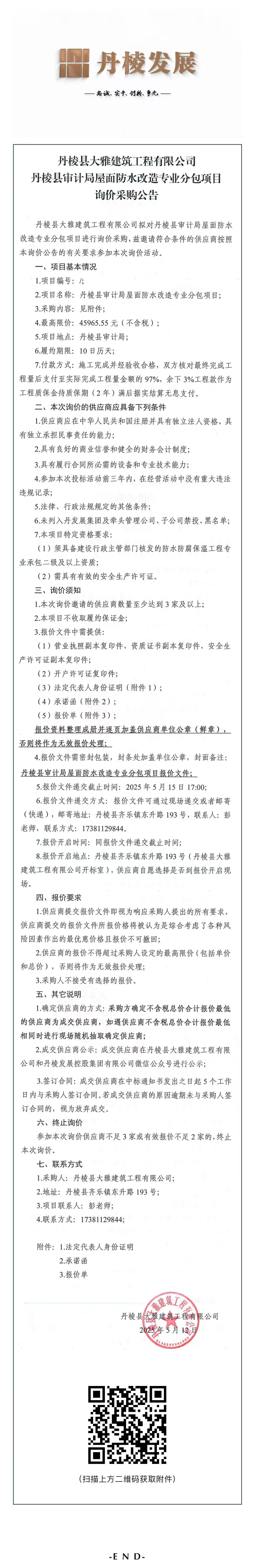 丹棱縣大雅建筑工程有限公司丹棱縣審計局屋面防水改造專業分包項目詢價采購公告