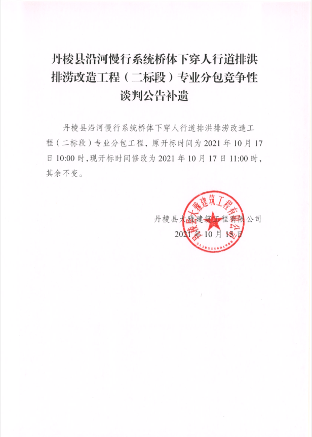 【大雅建筑公司】丹棱縣沿河慢行系統(tǒng)橋體下穿人行道排洪排澇改造工程(二標段)專業(yè)分包競爭性談判公告補遺