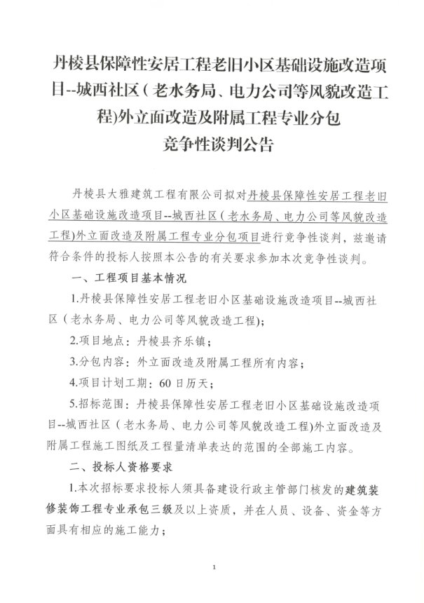 【大雅建筑公司】丹棱縣保障性安居工程老舊小區基礎設施改造項目--城西社區(老水務局、電力公司等風貌改造工程)外立面改造及附屬工程專業分包競爭性談判公告