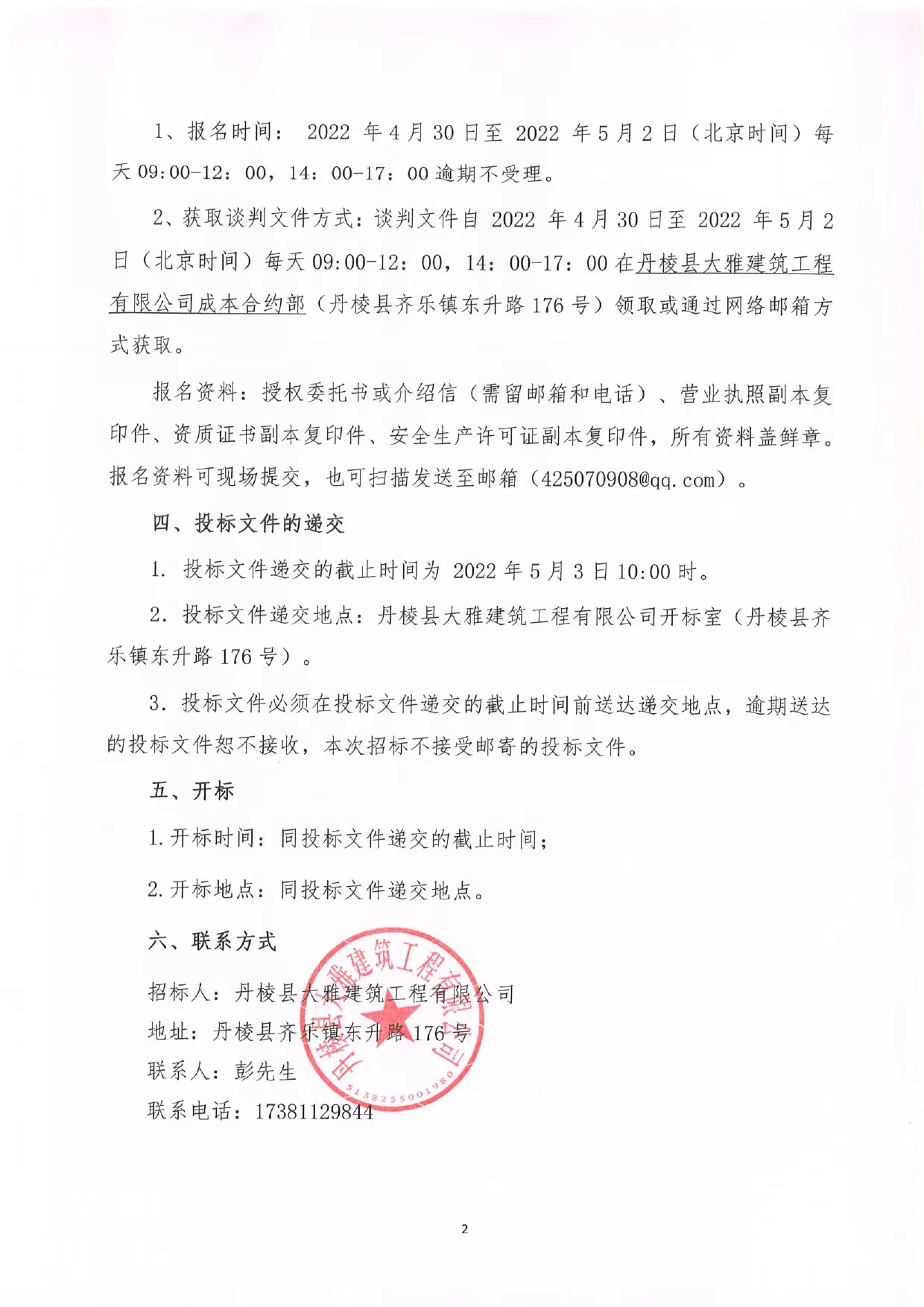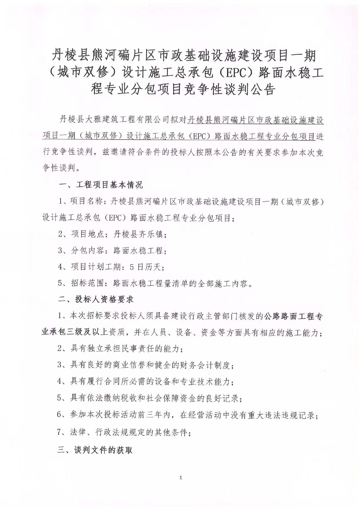 丹棱縣熊河碥片區市政基礎設施建設項目一期(城市雙修)設計施工總承包(EPC)路面水穩工 程專業分包項目競爭性談判公告