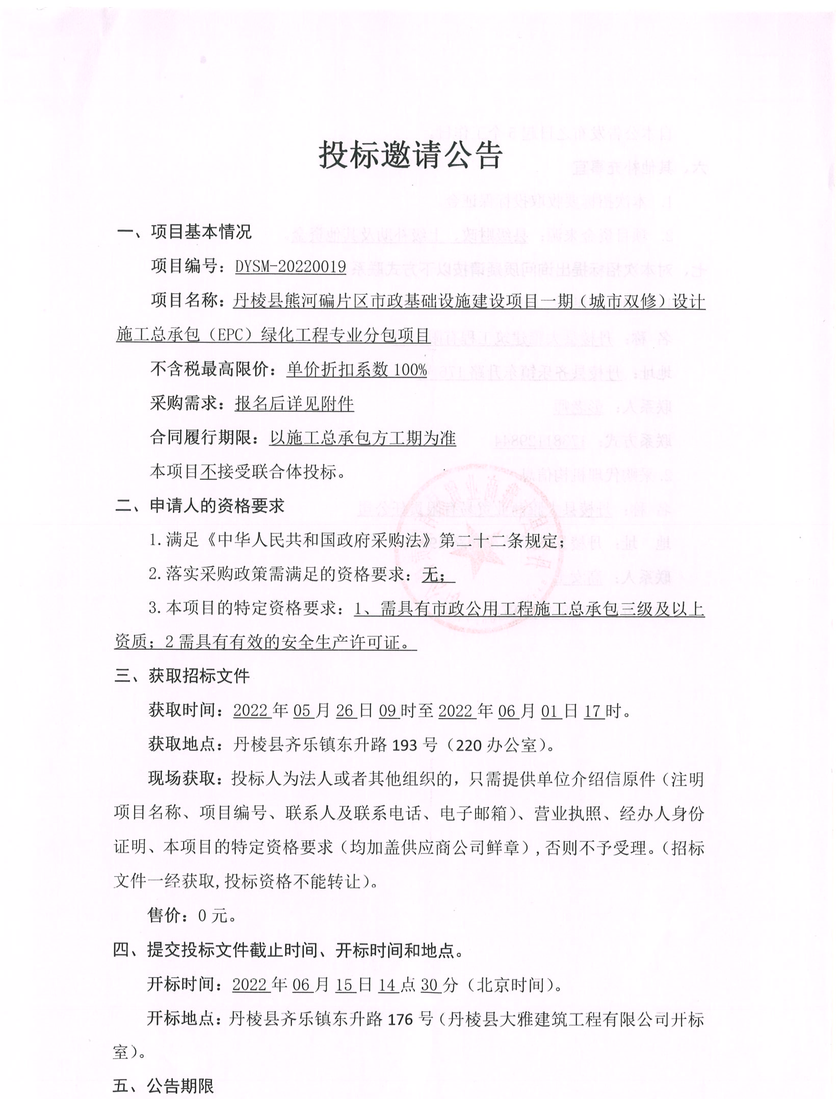 丹棱縣熊河碥片區市政基礎設施建設項目一期(城市雙修)設計施工總承包(EPC)綠化工程專業分包項目投標邀請公告
