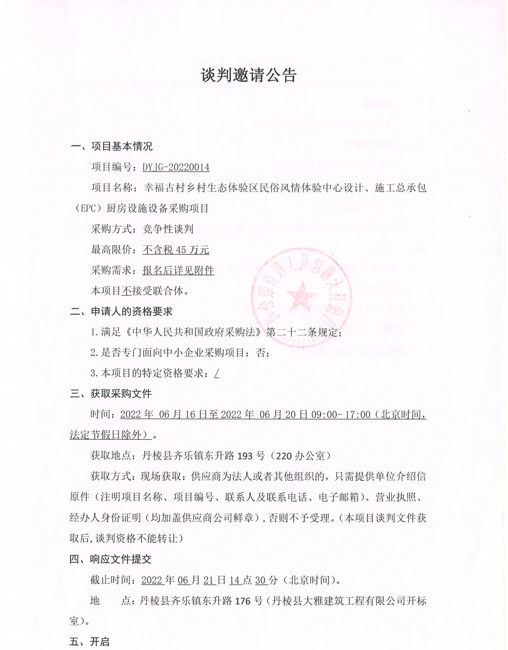 幸福古村鄉村生態體驗區民俗風情體驗中心設計、施工總承包(EPC)廚房設施設備采購項目談判邀請公告