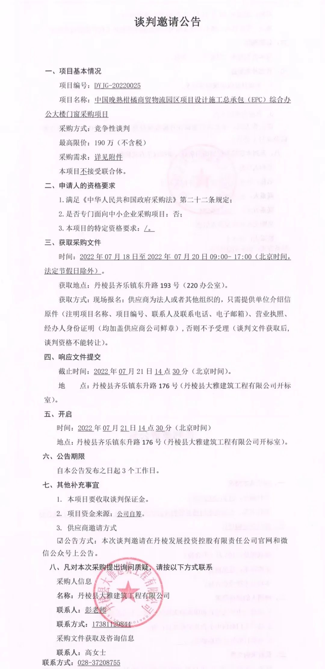 中國(guó)晚熟柑橘商貿(mào)物流園區(qū)項(xiàng)目設(shè)計(jì)施工總承包(EPC)綜合辦公大樓門(mén)窗采購(gòu)項(xiàng)目談判邀請(qǐng)公告