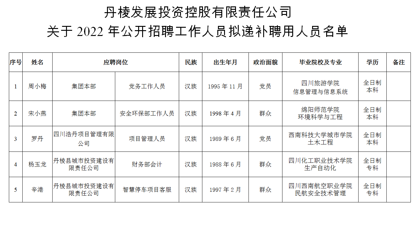 附件:丹棱發展投資控股有限責任公司關于2022年公開招聘工作人員擬遞補聘用人員名單