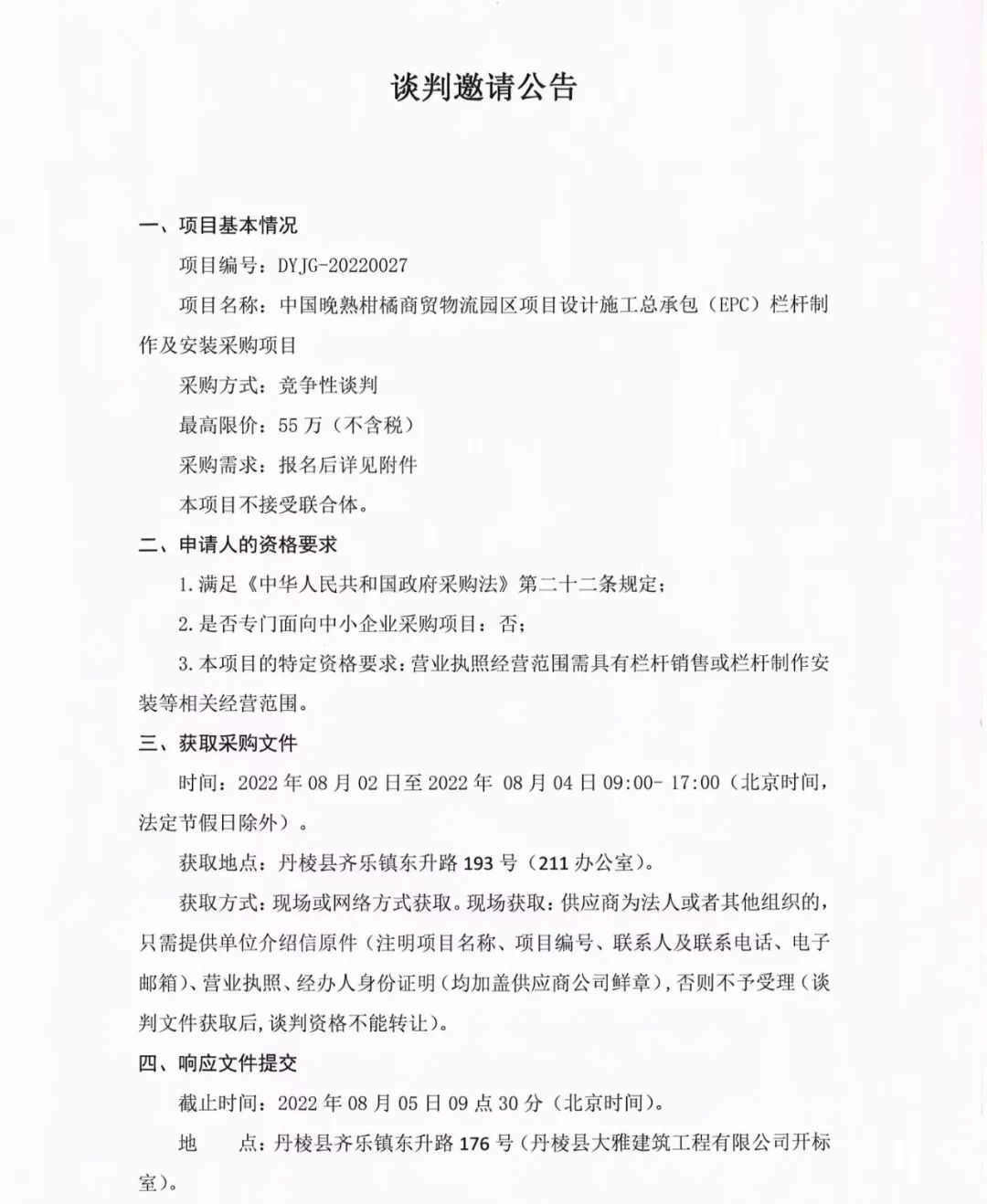 中國晚熟柑橘商貿物流園區項目設計施工總承包(EPC)欄桿制作及安裝采購項目談判邀請公告