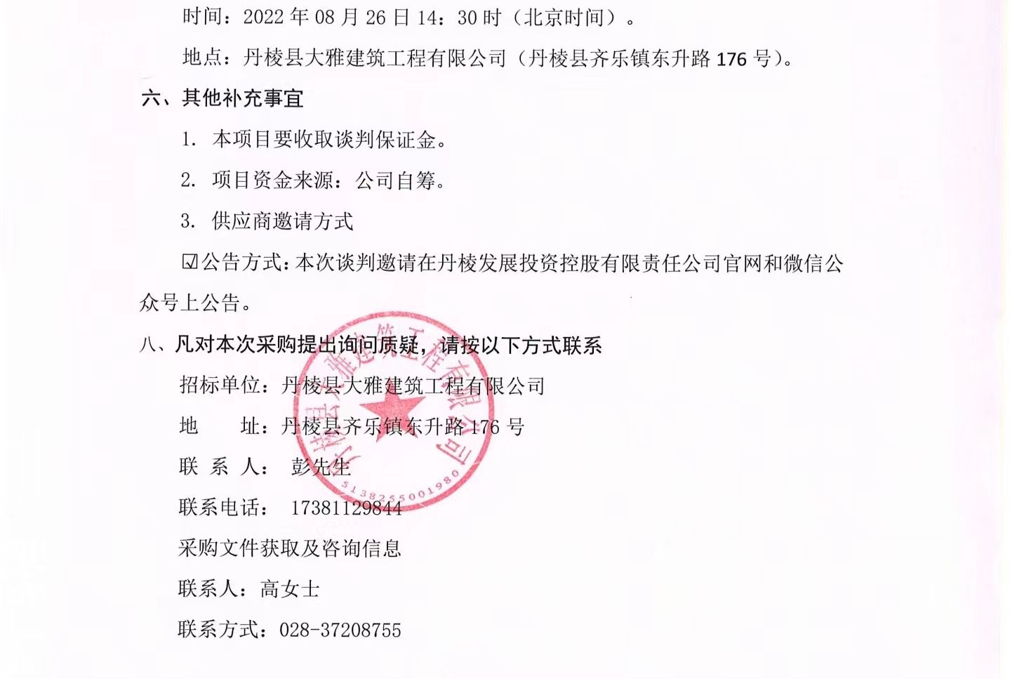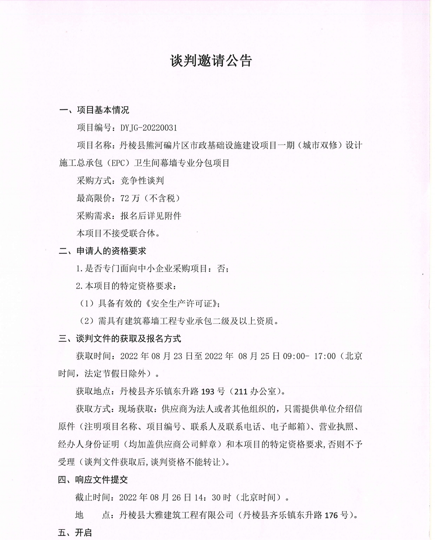 丹棱縣熊河碥片區市政基礎設施建設項目一期(城市雙修)設計施工總承包(EPC)衛生間幕墻專業分包項目談判邀請公告