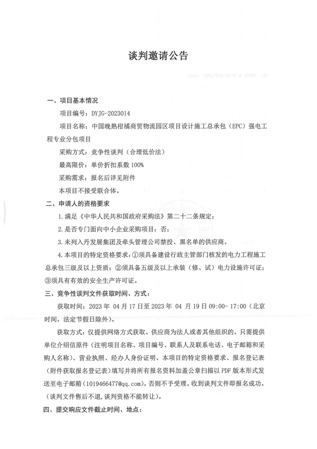 中國晚熟柑橘商貿物流園區項目設計施工總承包(EPC)強電工程專業分包項目談判邀請公告