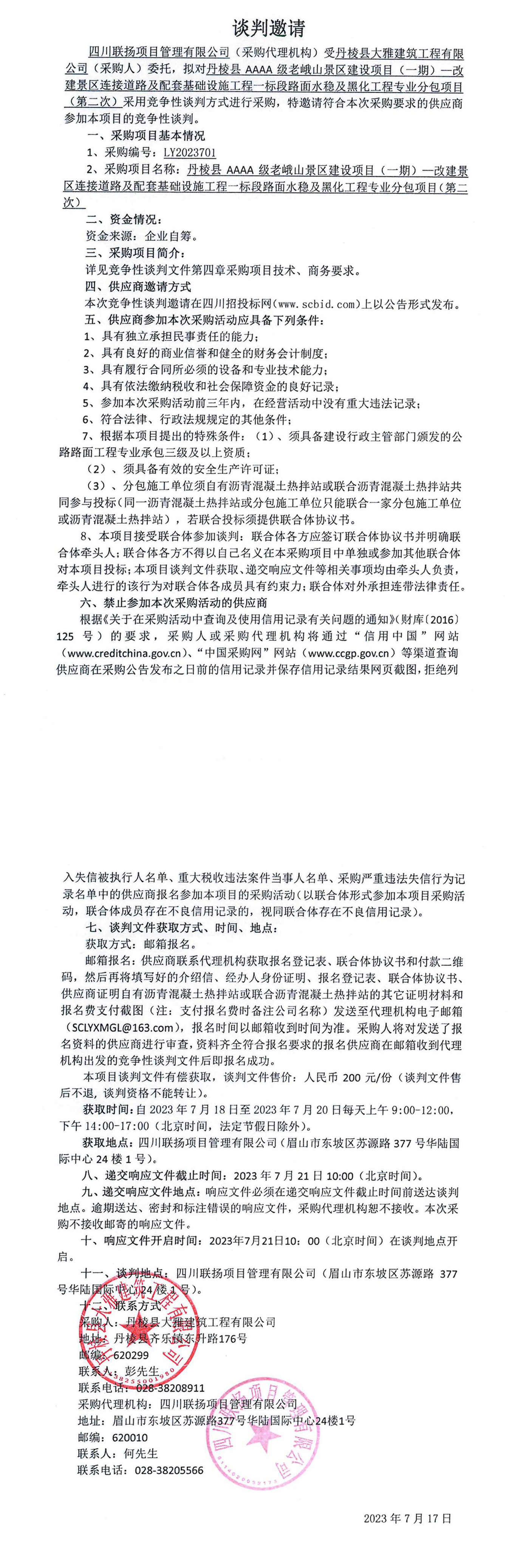 丹棱縣AAAA級老峨山景區建設項目(一期)—改建景區連接道路及配套基礎設施工程一標段水穩及黑化工程專業分包談判邀請公告(第二次)