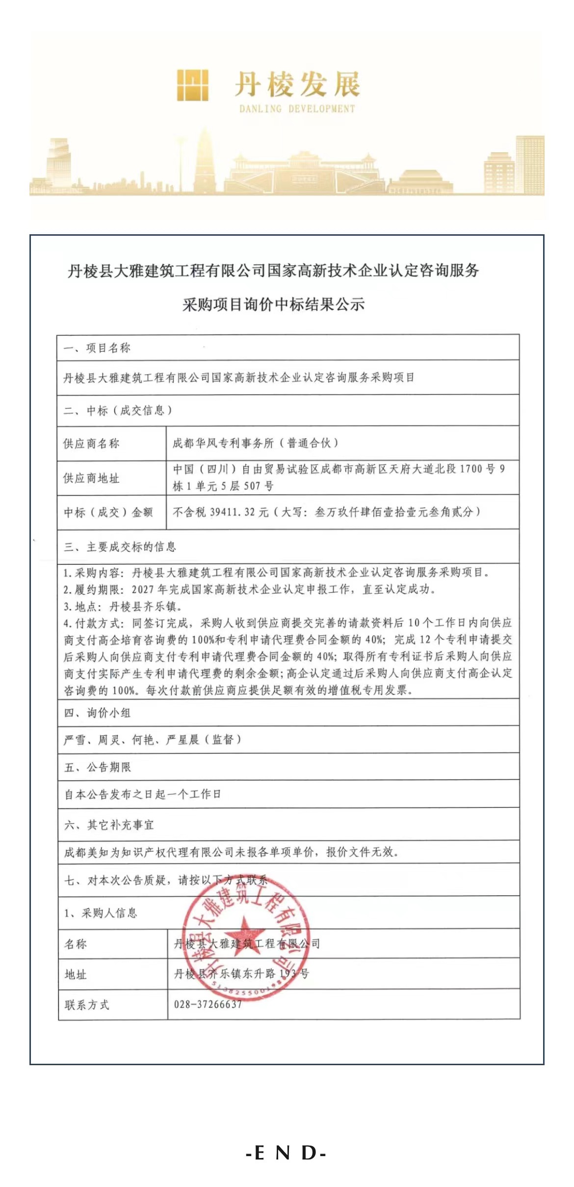 丹棱縣大雅建筑工程有限公司國家高新技術企業認定咨詢服務采購項目詢價中標結果公示