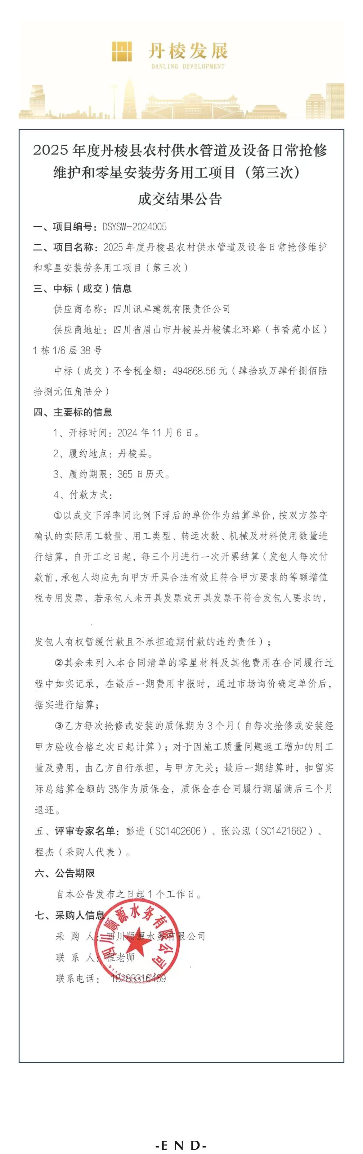 2025年度丹棱縣農村供水管道及設備日常搶修維護和零星安裝勞務用工項目(第三次)成交結果公告