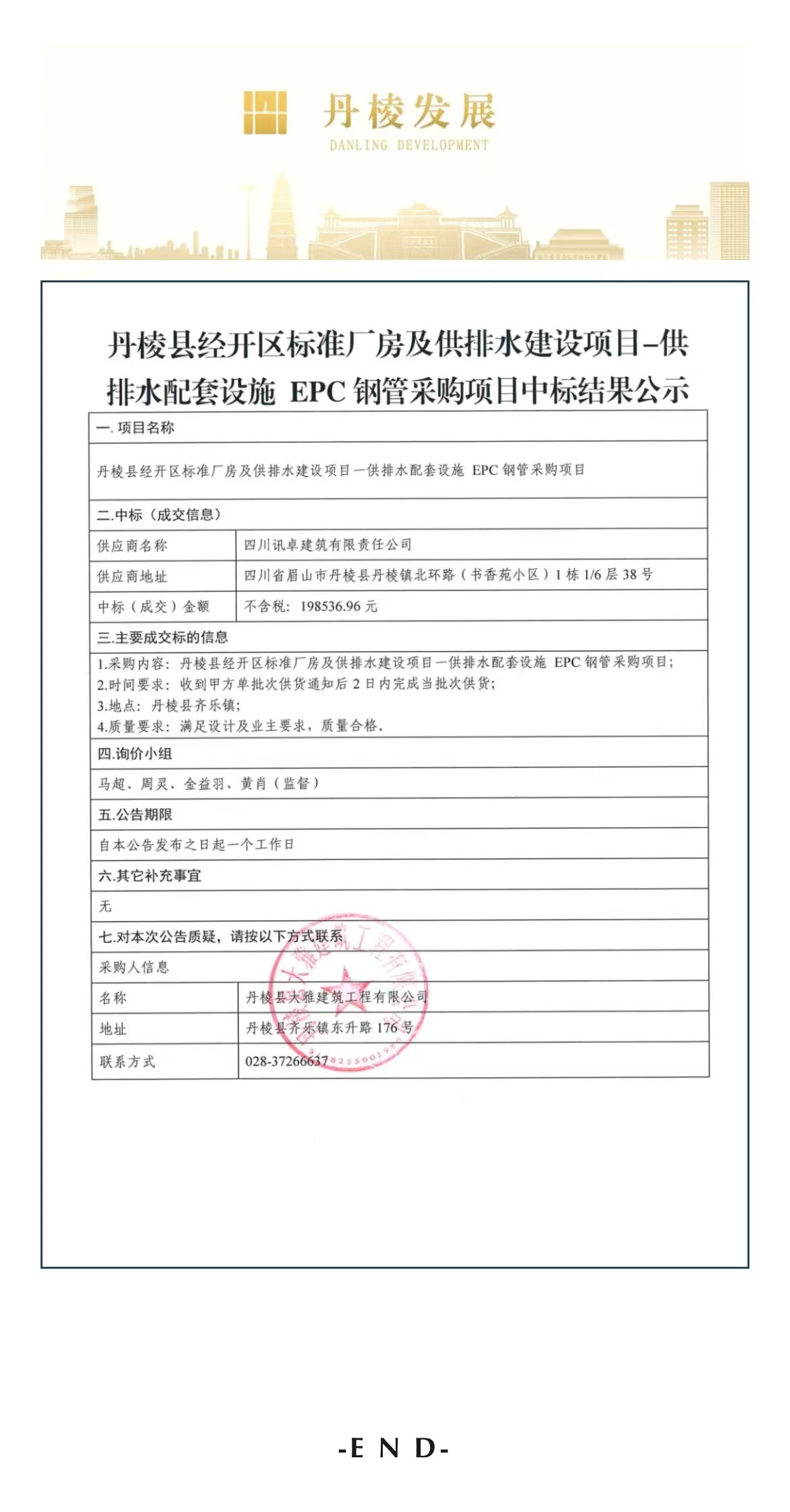 丹棱縣經開區標準廠房及供排水建設項目——供排水配套設施EPC鋼管采購項目中標結果公示