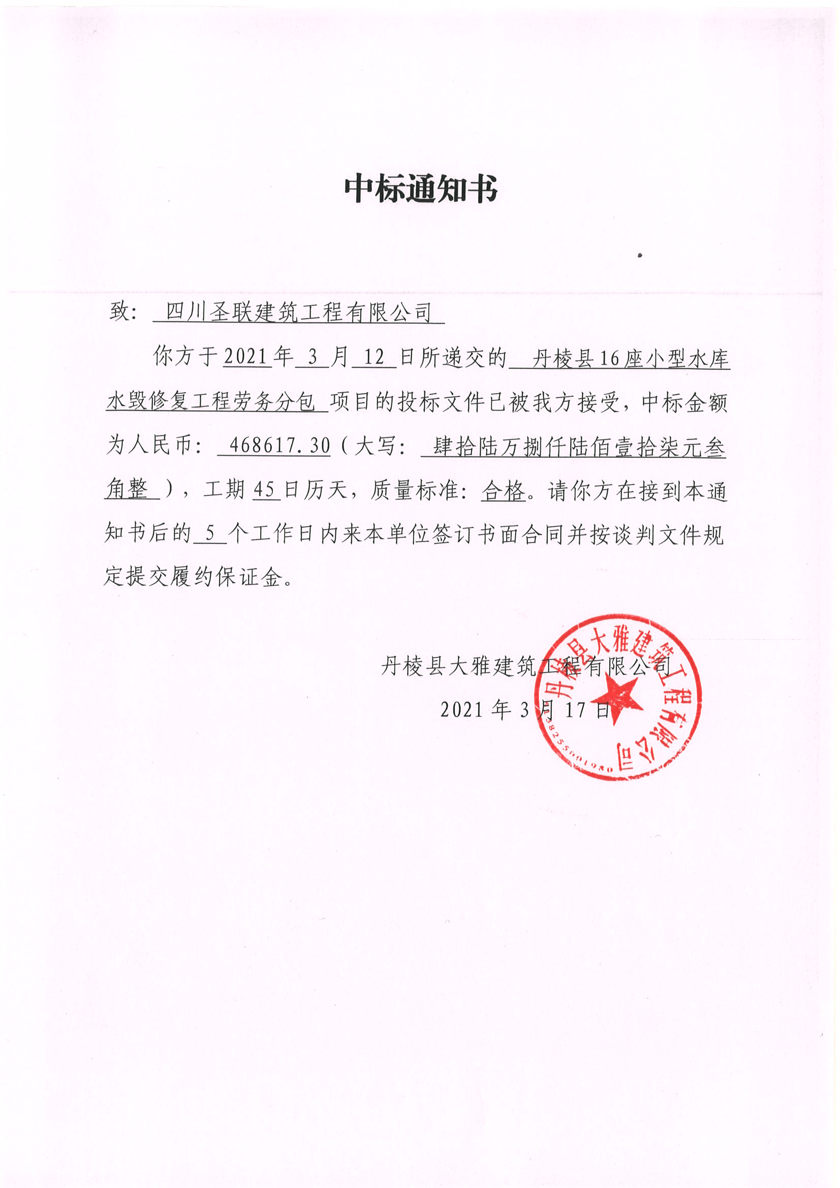【大雅建筑公司】丹棱縣16座小型水庫水毀修復工程勞務分包中標成交公告