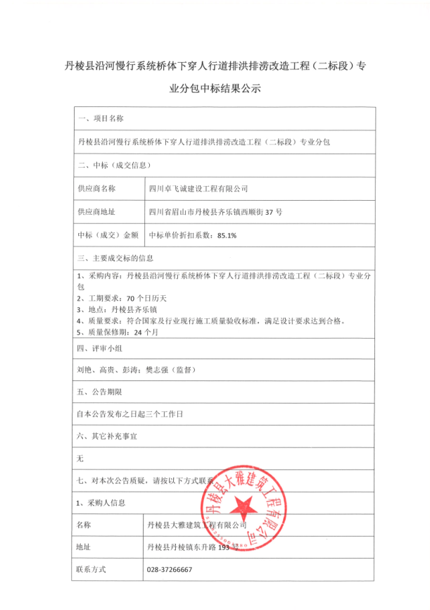 【大雅建筑公司】丹棱縣沿河慢行系統橋體下穿人行道排洪排澇改造工程(二標段)專業分包中標結果公示