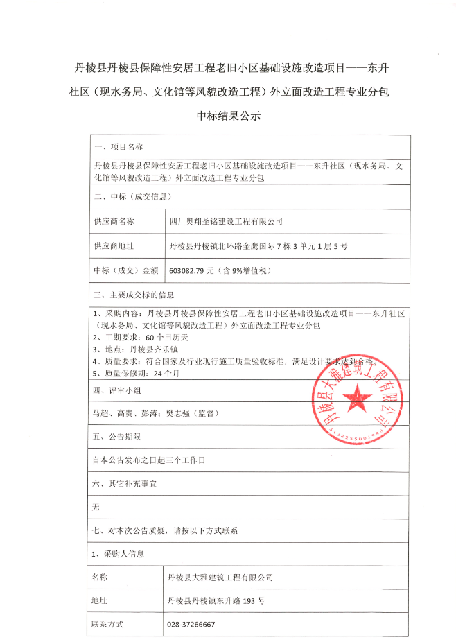 【大雅建筑公司】丹棱縣保障性安居工程老舊小區基礎設施改造項目--東升社區(現水務局、文化館等風貌改造工程)外立面改造工程專業分包中標結果公示