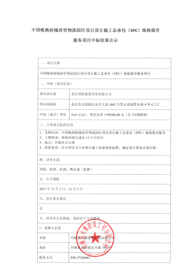 【大雅建筑公司】中國晚熟柑橘商貿(mào)物流園區(qū)項目設(shè)計施工總承包(EPC)場地強夯服務(wù)項目中標(biāo)結(jié)果公示
