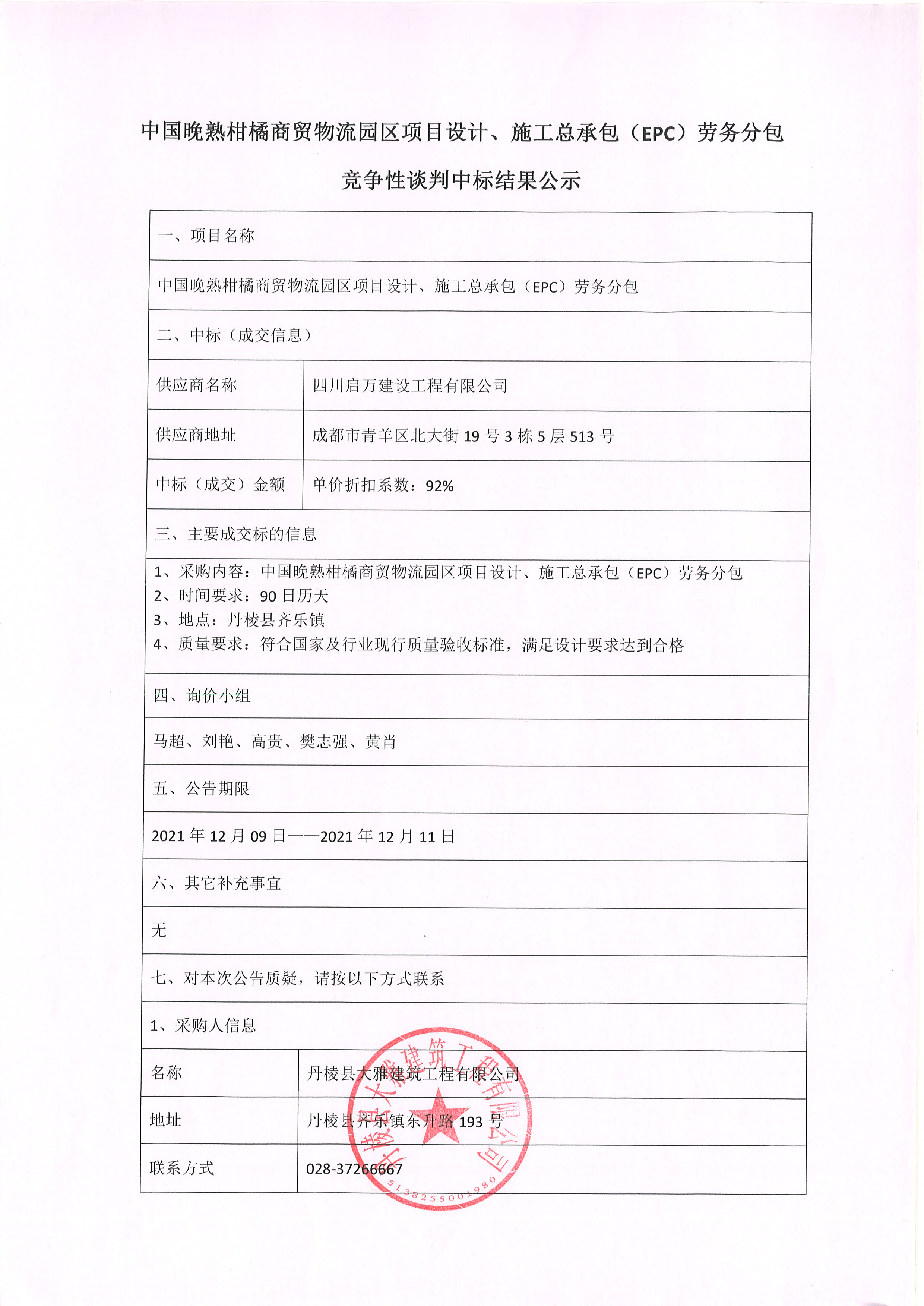【大雅建筑公司】中國晚熟柑橘商貿物流園區項目設計、施工總承包(EPC)勞務分包競爭性談判中標結果公示