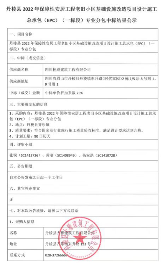 丹棱縣2022年保障性安居工程老舊小區基礎設施改造項目設計施工總承包(EPC)(一標段)專業分包中標結果公示