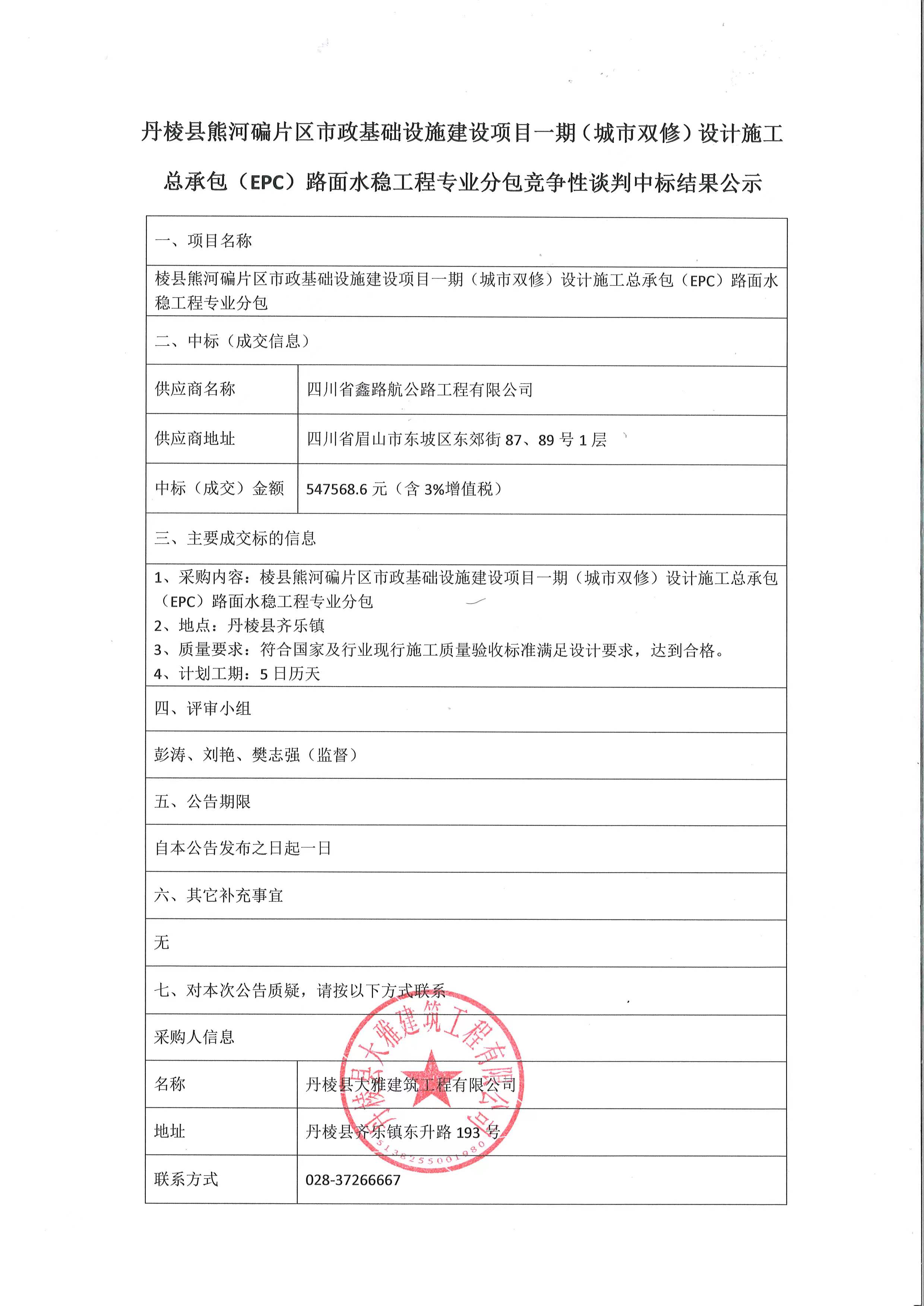 丹棱縣熊河碥片區市政基礎設施建設項目一期(城市雙修)設計施工總承包(EPC)路面水穩工程專業分包競爭性談判中標結果公示