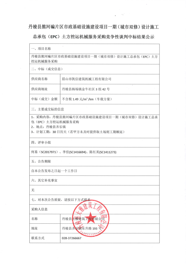 丹棱縣熊河碥片區市政基礎設施建設項目一期(城市雙修)設計施工 總承包(EPC)土方挖運機械服務采購競爭性談判中標結果公示