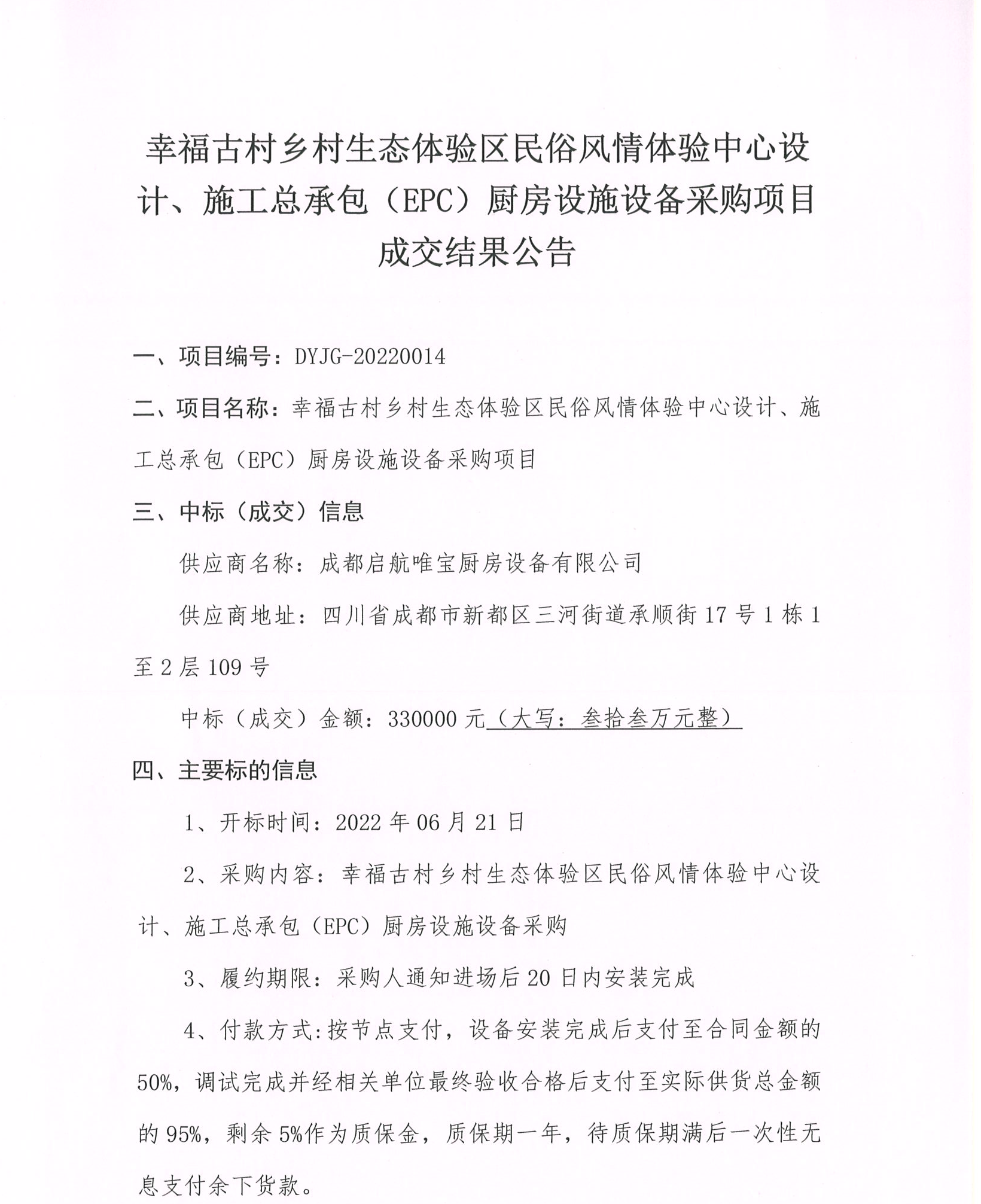 幸福古村鄉村生態體驗區民俗風情體驗中心設計、施工總承包(EPC)廚房設施設備采購項目成交結果公告