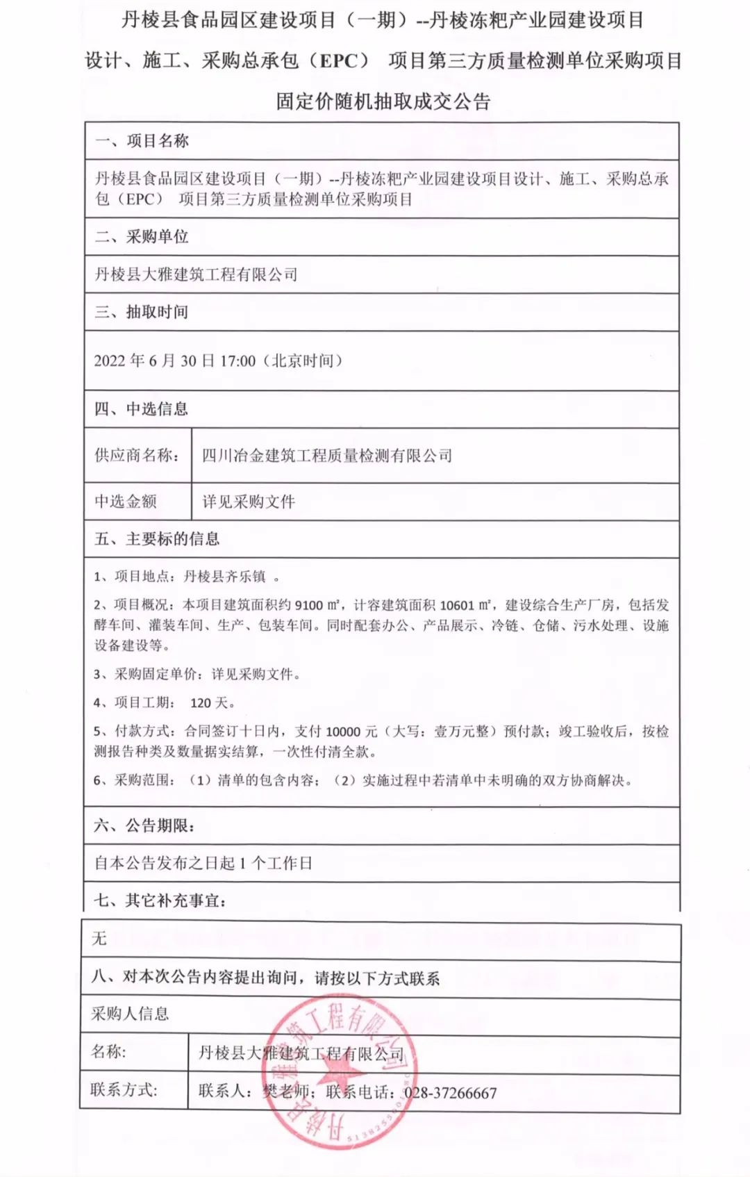 丹棱凍粑產業園建設項目設計、施工、采購總承包(EPC)項目第三方質量檢測單位采購項目固定價隨機抽取成交公告