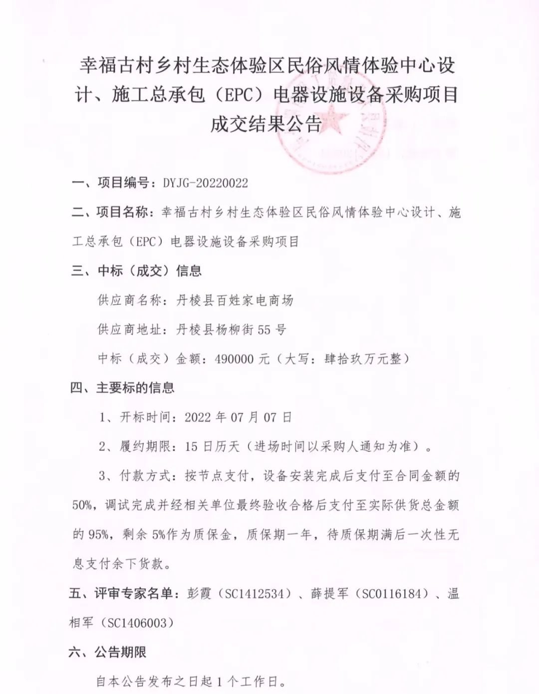 幸福古村鄉村生態體驗區民俗風情體驗中心設計、施工總承包(EPC)電器設施設備采購項目成交結果公告