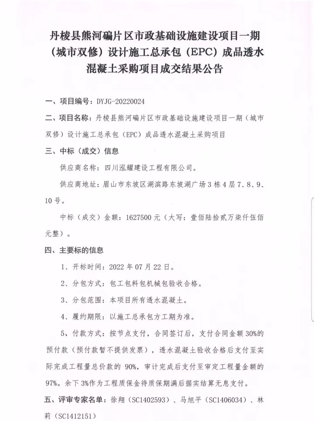 丹棱縣熊河碥片區市政基礎設施建設項目一期(城市雙修)設計施工總承包(EPC)成品透水混凝土采購項目成交結果公告
