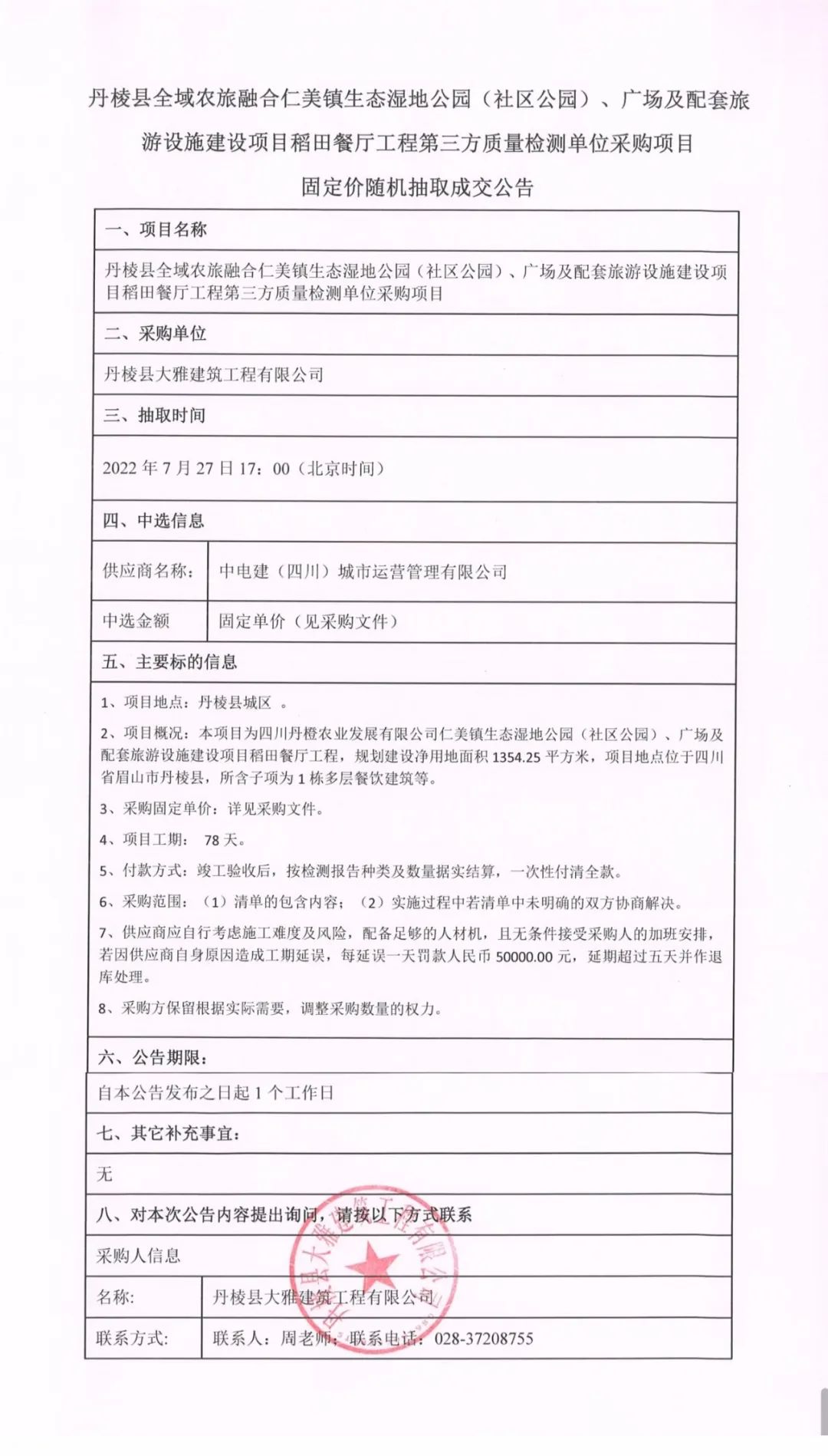 仁美鎮生態濕地公園(社區公園)、廣場及配套旅游設施建設項目稻田餐廳工程第三方質量檢測單位采購項目固定價隨機抽取成交公告