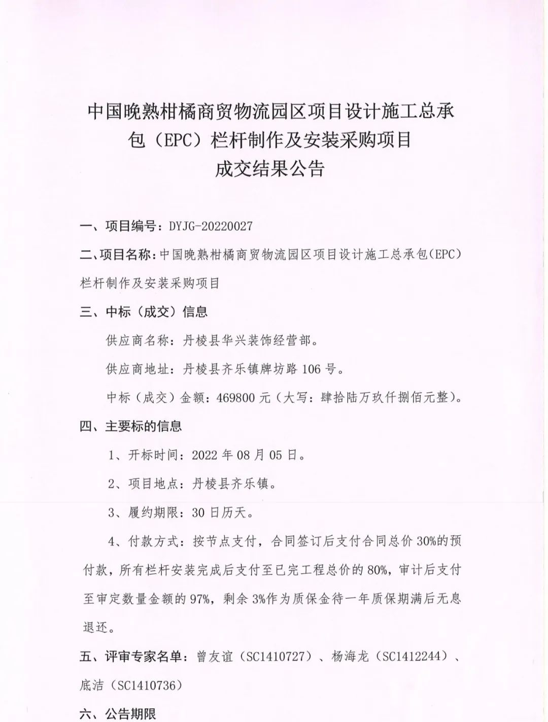 中國晚熟柑橘商貿(mào)物流園區(qū)項(xiàng)目設(shè)計(jì)施工總承包(EPC)欄桿制作及安裝采購項(xiàng)目成交結(jié)果公告
