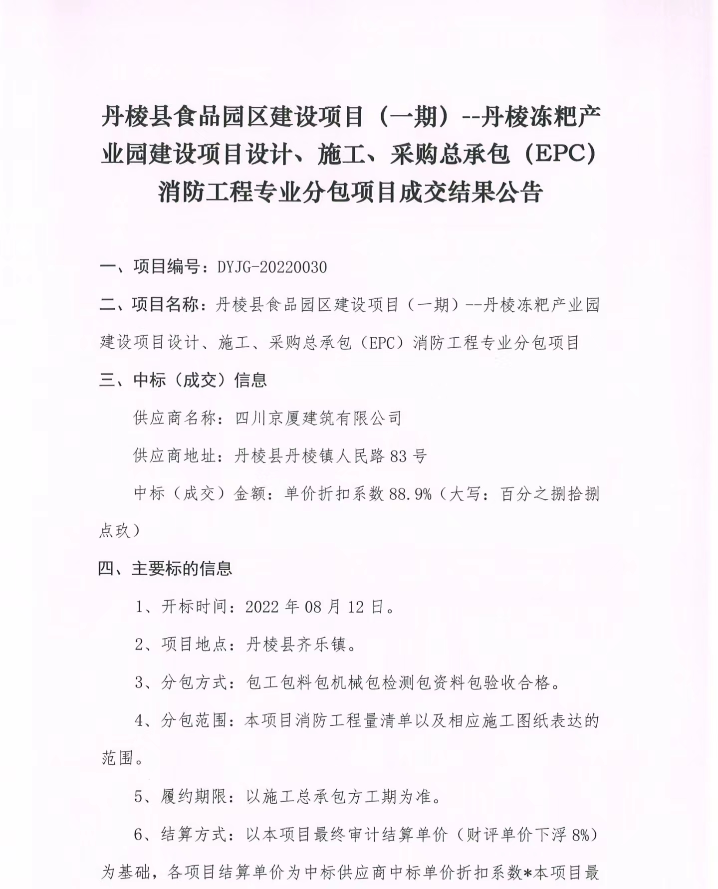 丹棱縣食品園區建設項目(一期)--丹棱凍粑產業園建設項目設計、施工、采購總承包(EPC)消防工程專業分包項目成交結果公告