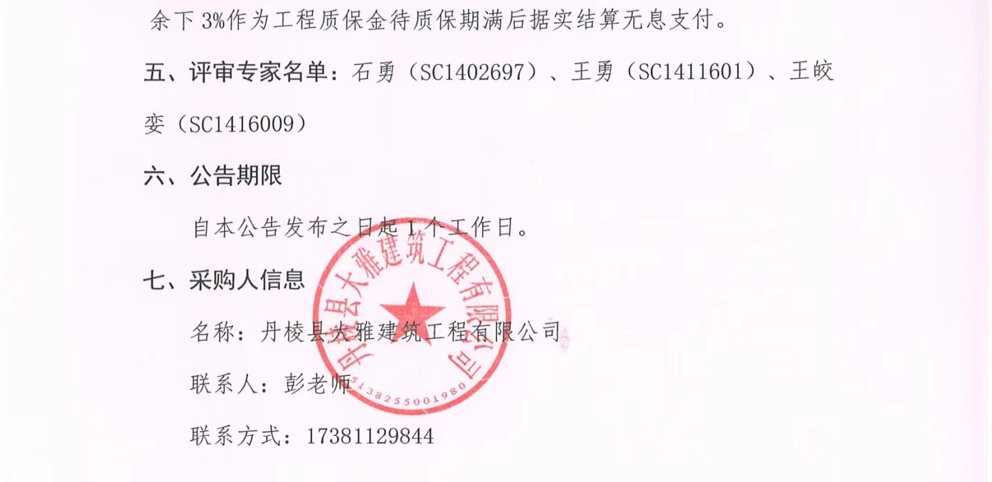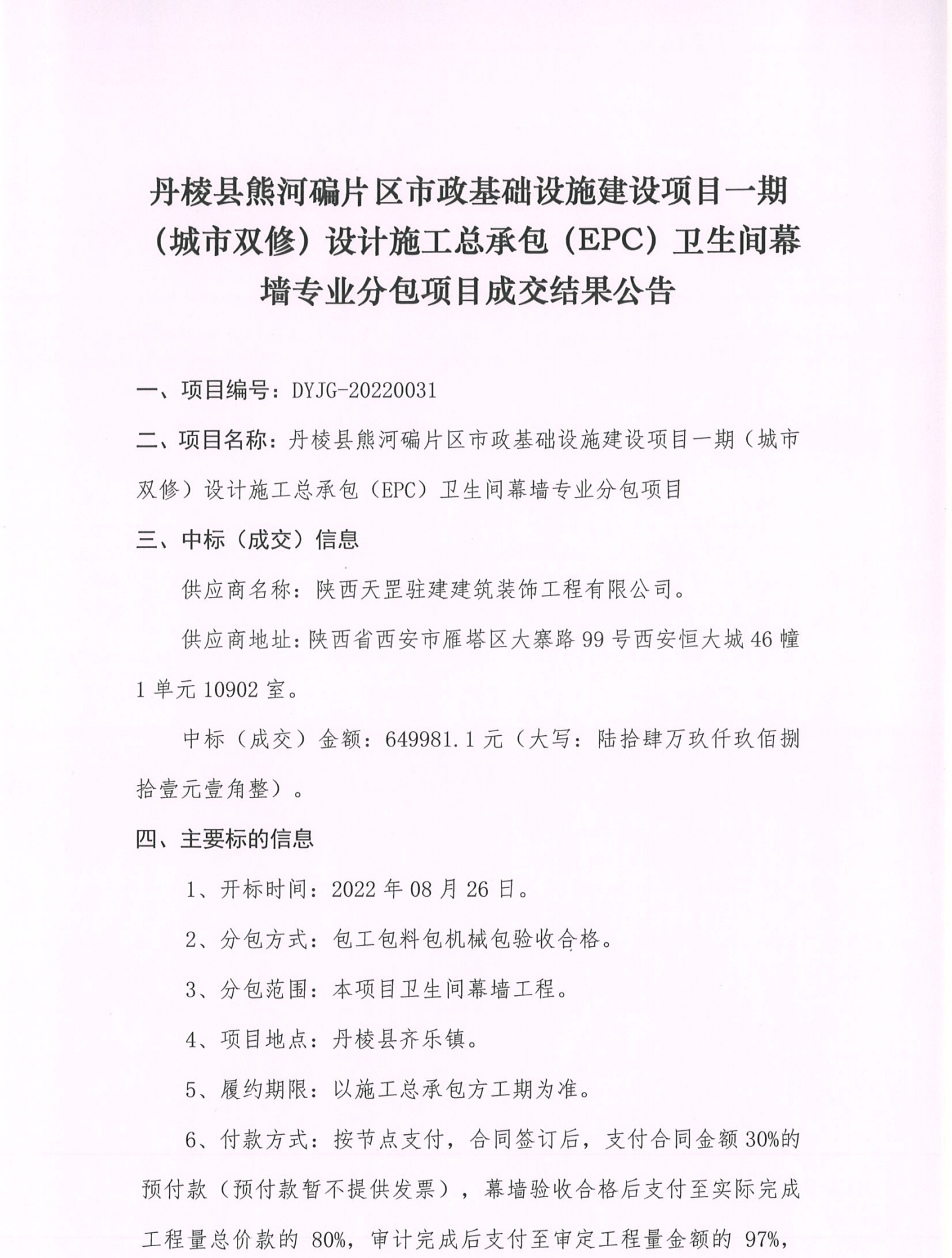丹棱縣熊河碥片區市政基礎設施建設項目一期(城市雙修)設計施工總承包(EPC)衛生間幕墻專業分包項目成交結果公告