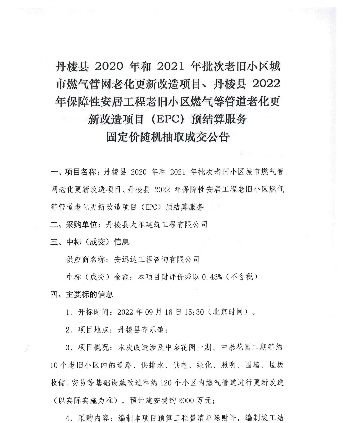 丹棱縣 2020 年、2021年及2022年批次老舊小區城市燃氣管網老化更新改造項目預結算服務固定價隨機抽取成交公告