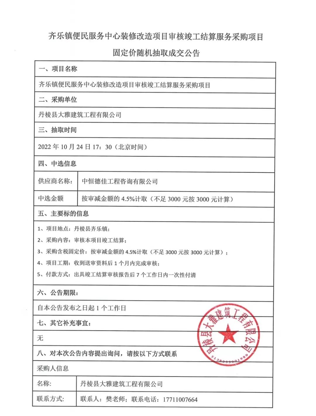 齊樂鎮便民服務中心裝修改造項目審核竣工結算服務采購項目固定價隨機抽取成交公告