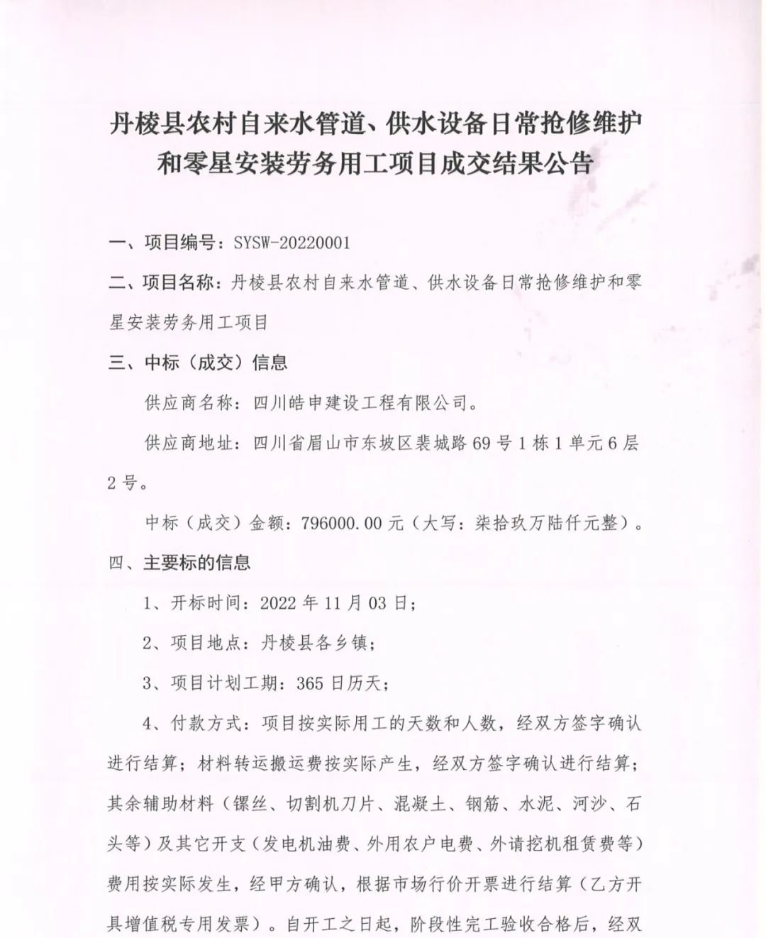 丹棱縣農村自來水管道、供水設備日常搶修維護和零星安裝勞務用工項目成交結果公告