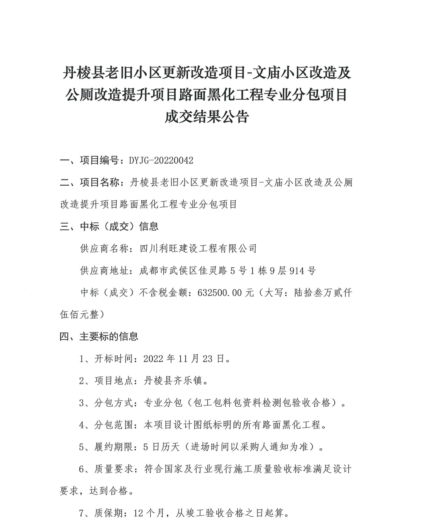 丹棱縣老舊小區更新改造項目-文廟小區改造及公廁改造提升項目路面黑化工程專業分包項目成交結果公告
