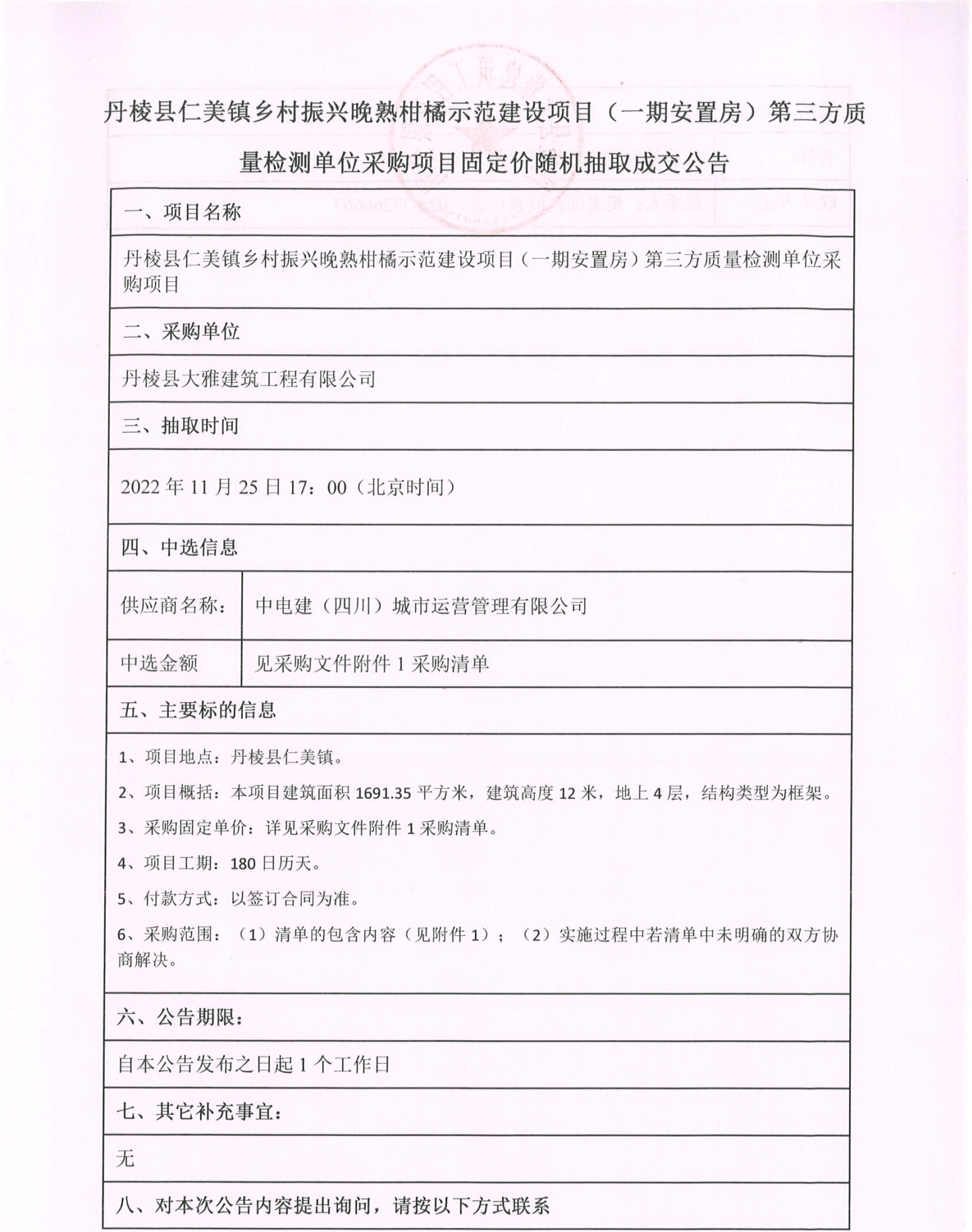 丹棱縣仁美鎮鄉村振興晚熟柑橘示范建設項目(一期安置房) 第三方質量檢測單位采購項目固定價隨機抽取成交公告