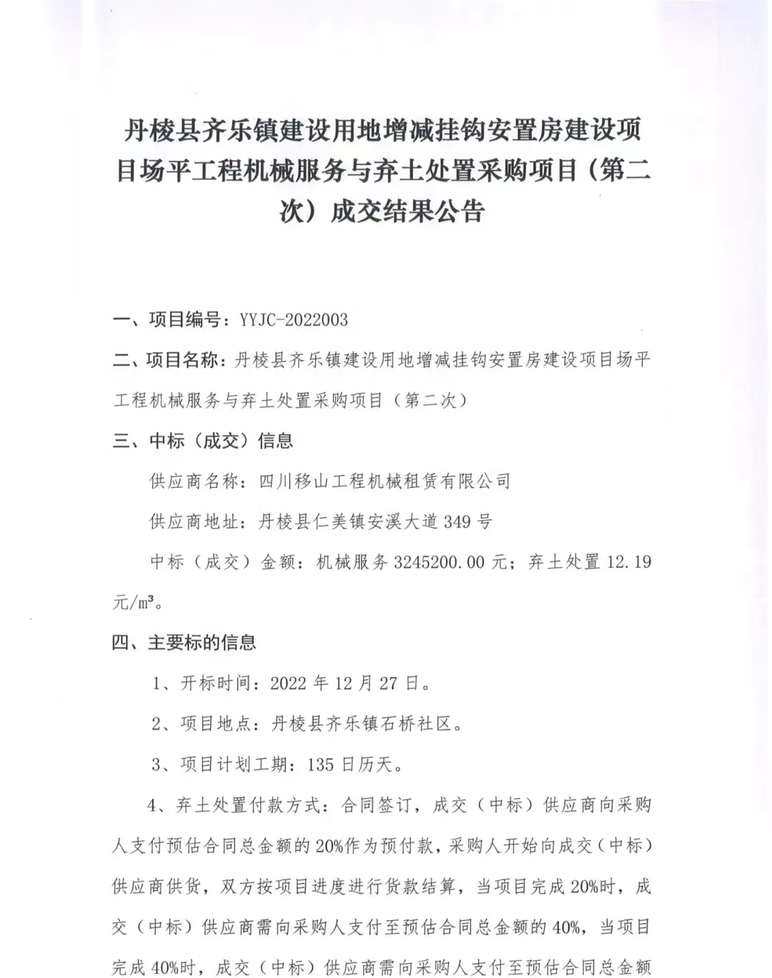 丹棱縣齊樂鎮建設用地增減掛鉤安置房建設項目場平工程機械服務與棄土處置采購項目(第二次)成交結果公告