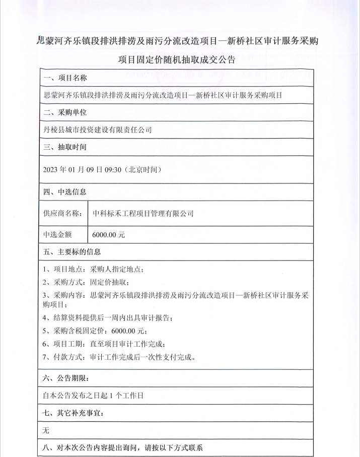 思蒙河齊樂鎮(zhèn)段排洪排澇及雨污分流改造項目--新橋社區(qū)審計服務(wù)采購項目固定價隨機抽取成交公告