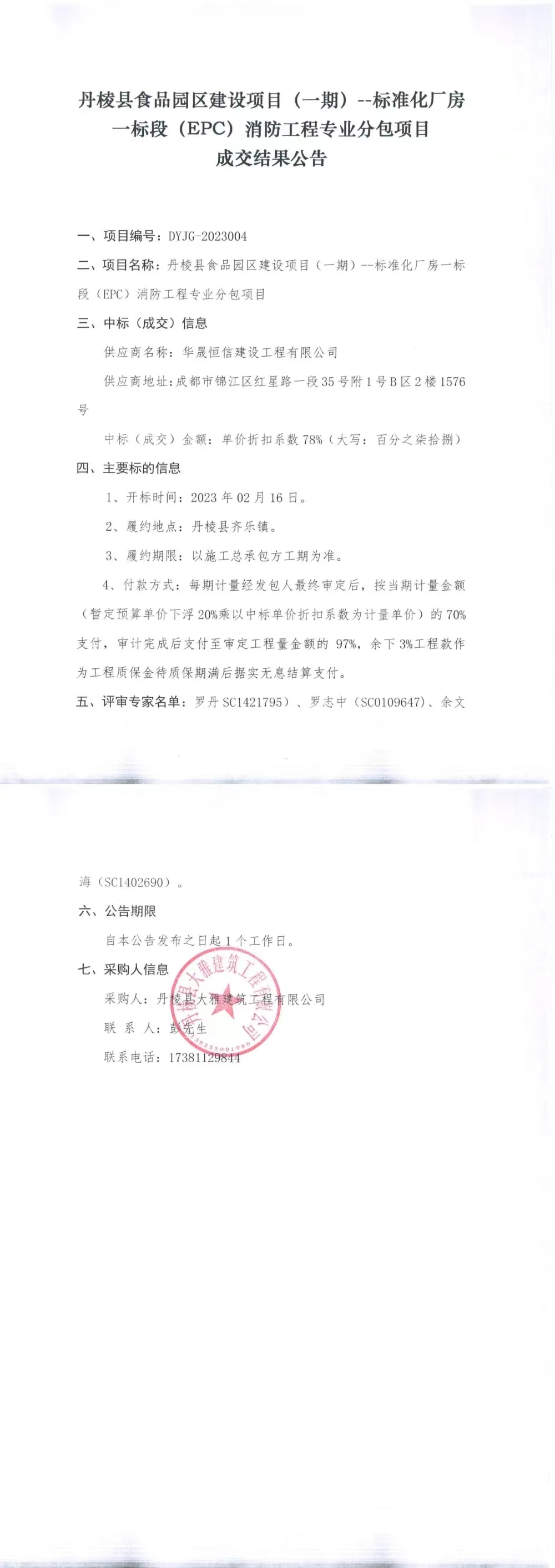 丹棱縣食品園區建設項目(一期)--標準化廠房一標段(EPC)消防工程專業分包項目成交結果公告