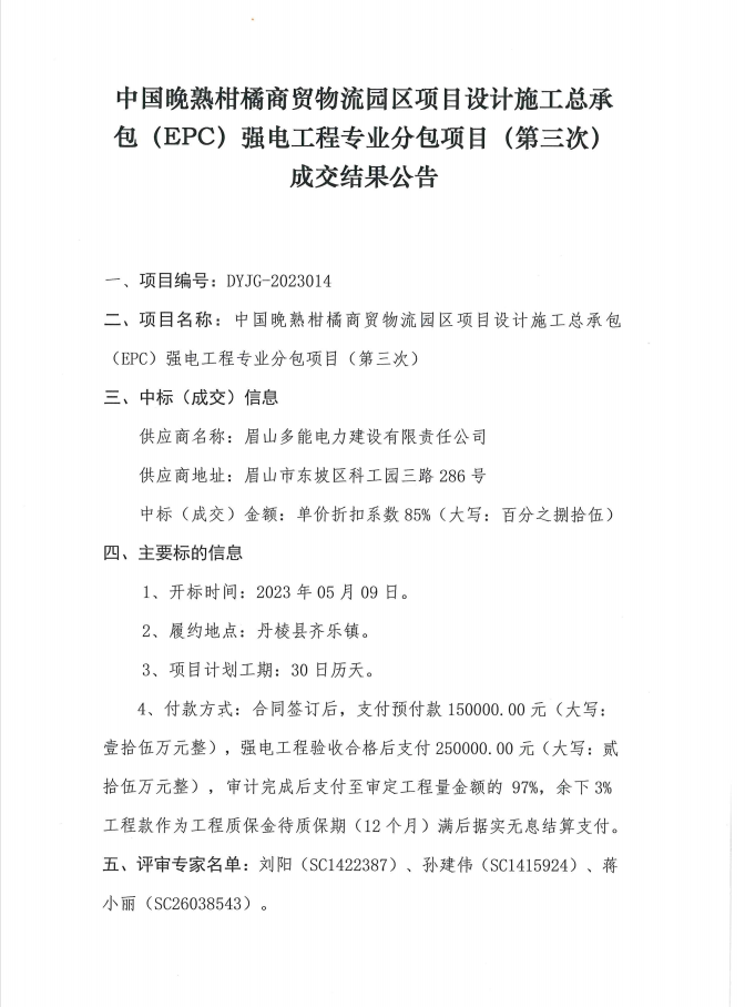 中國晚熟柑橘商貿物流園區項目設計施工總承包(EPC)強電工程專業分包項目(第三次)成交結果公告
