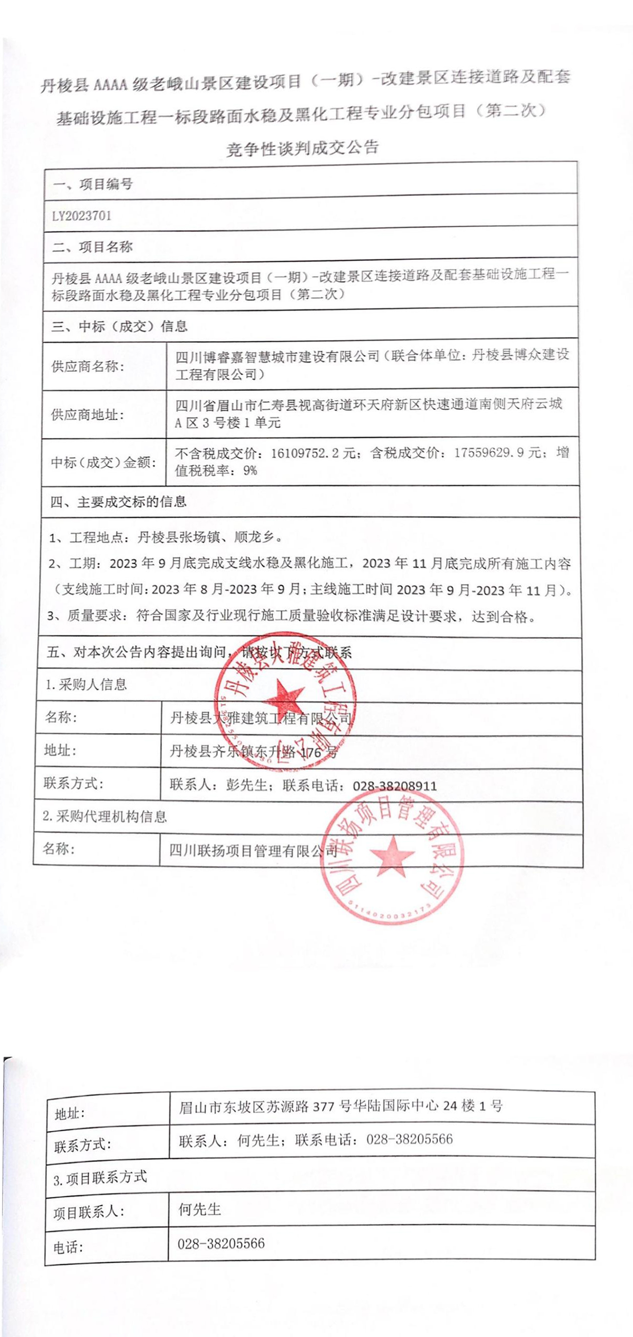 丹棱縣AAAA級老峨山景區建設項目(一期)—改建景區連接道路及配套基礎設施工程一標段路面水穩及黑化工程專業分包項目成交公告