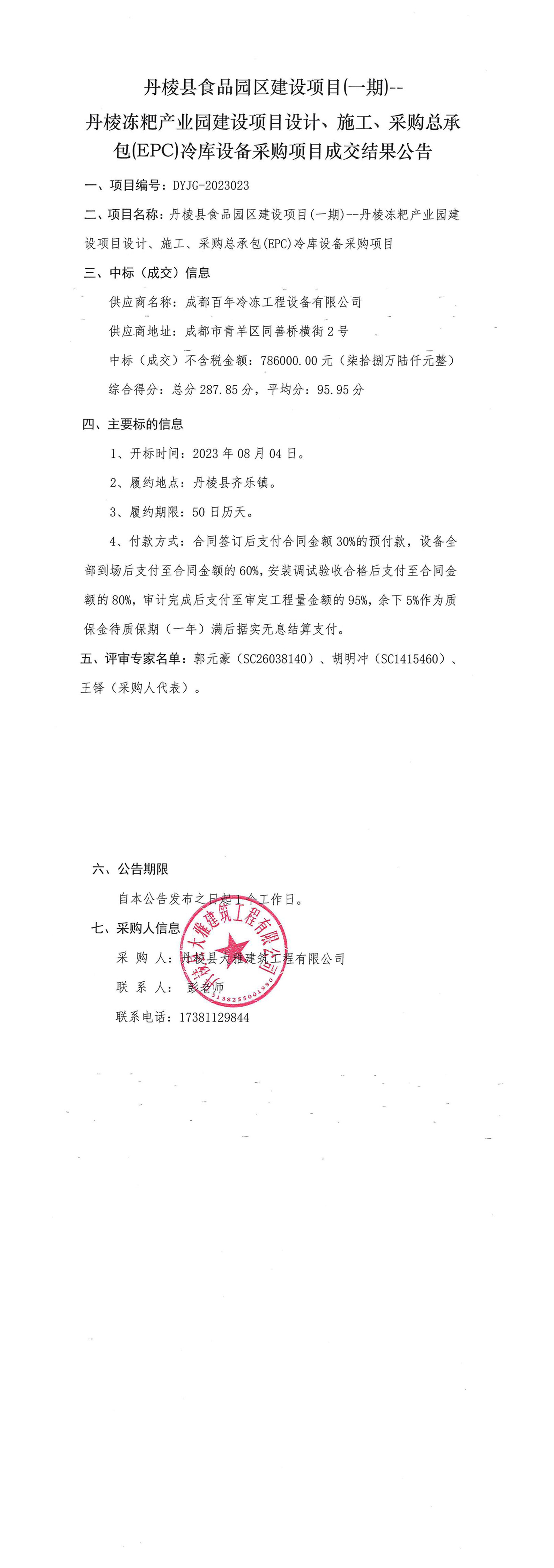 丹棱縣食品園區建設項目(一期)--丹棱凍粑產業園建設項目設計、施工、采購總承包(EPC)冷庫設備采購項目成交結果公告