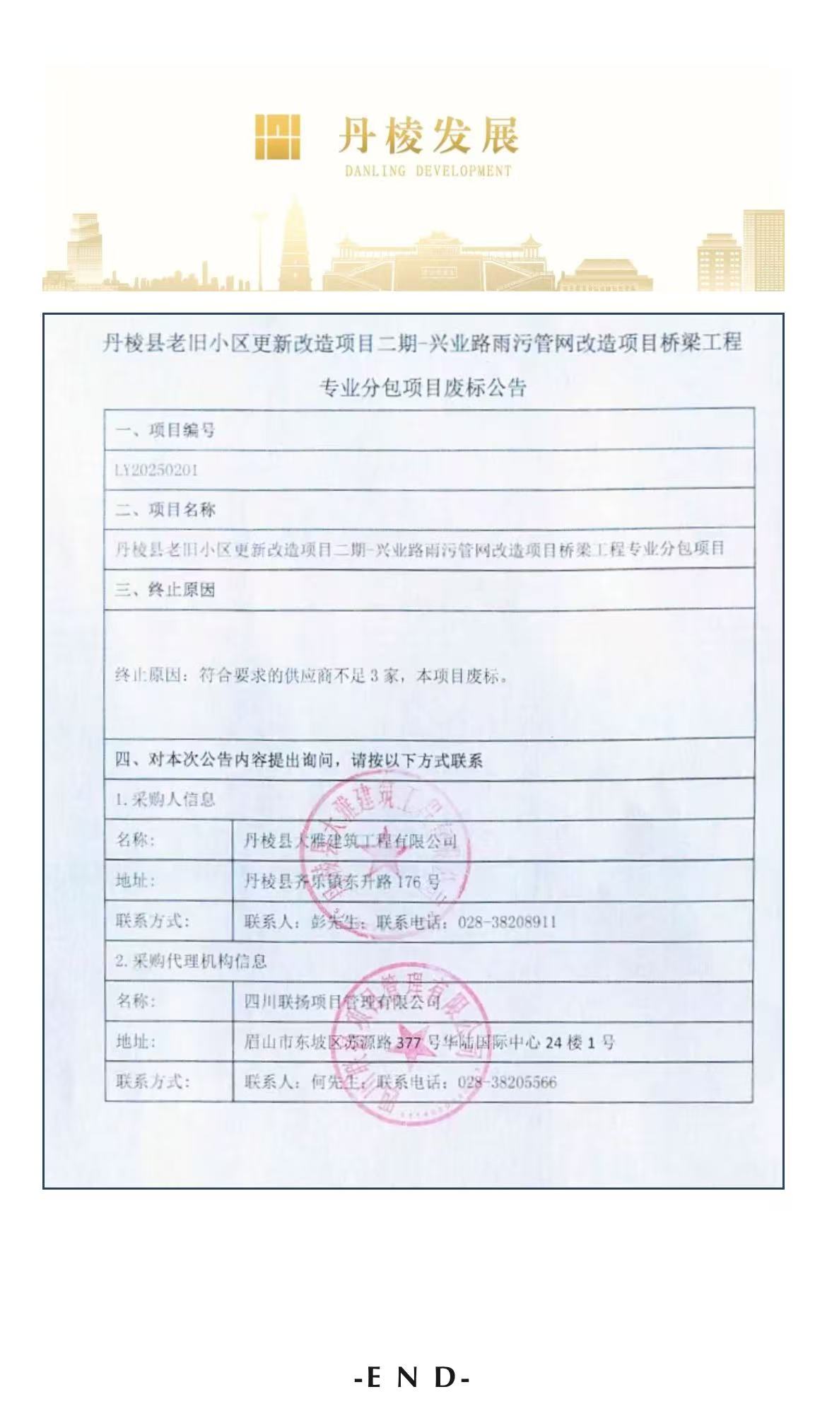 丹棱縣老舊小區(qū)更新改造項(xiàng)目二期-興業(yè)路雨污管網(wǎng)改造項(xiàng)目橋梁工程專(zhuān)業(yè)分包項(xiàng)目廢標(biāo)公告