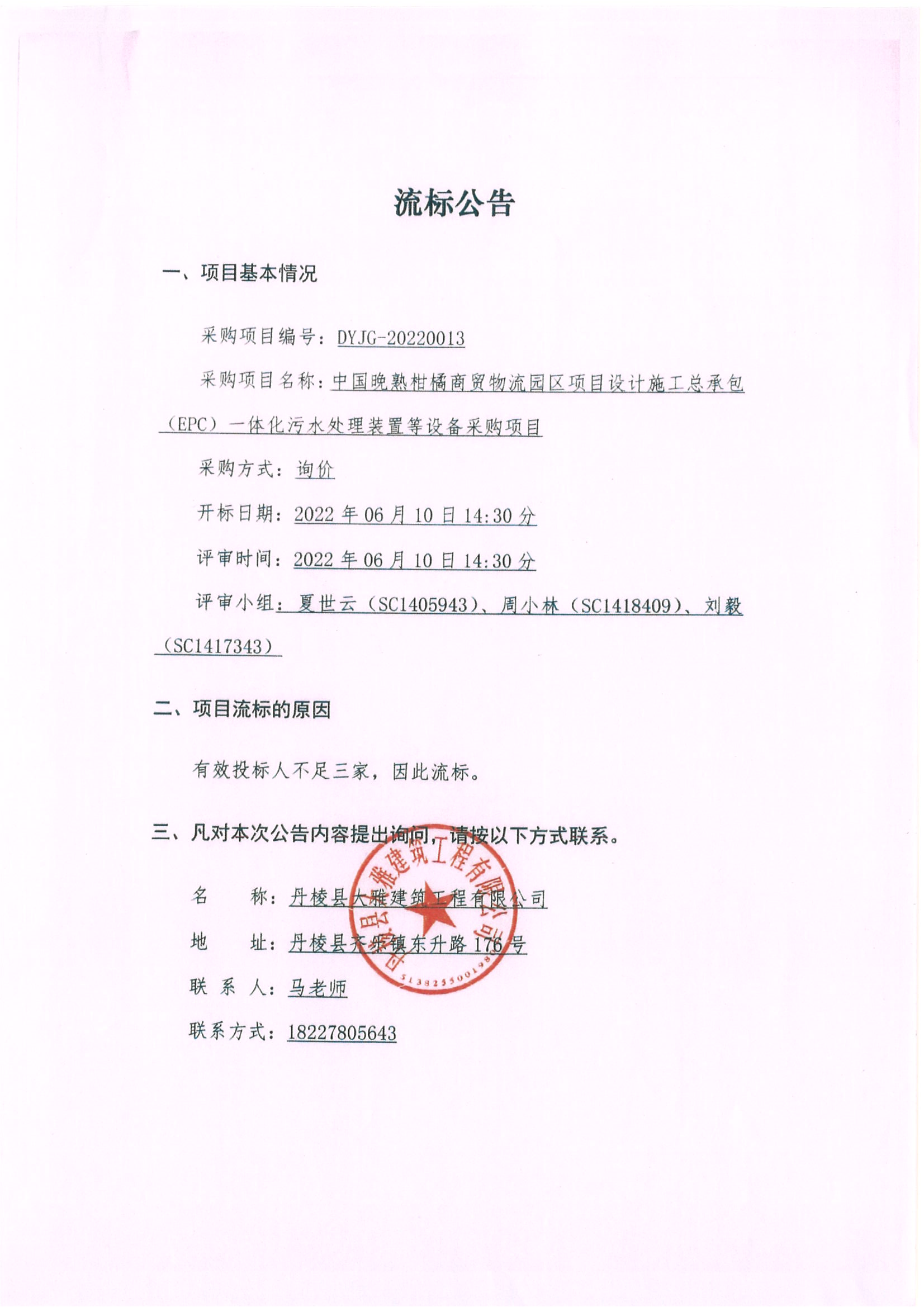 中國晚熟柑橘商貿物流園區項目設計施工總承包(EPC)一體化污水處理裝置等設備采購項目流標公告