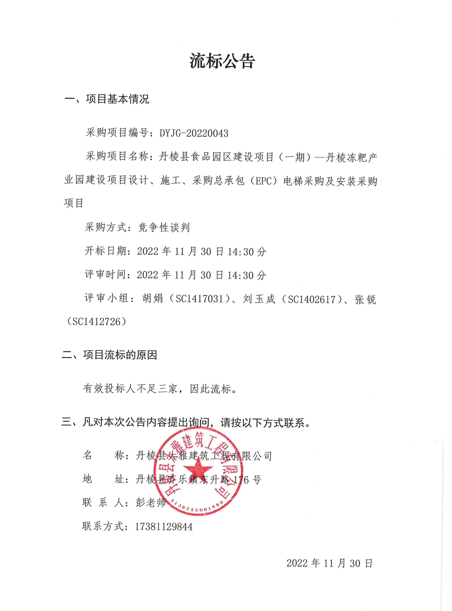丹棱縣食品園區建設項目 (一期)--丹棱凍粑產業園建設項目設計、施工、采購總承包 (EPC) 電梯采購及安裝采購項目流標公告
