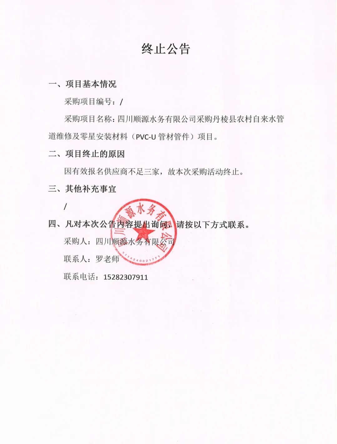 四川順源水務(wù)有限公司采購丹棱縣農(nóng)村自來水管道維修及零星安裝材料(PVC-U管材管件)項目終止公告