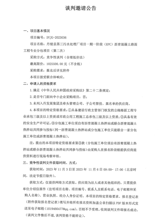 丹棱縣第三污水處理廠項目一期一階段(EPC)瀝青混凝土路面工程專業分包項目(第二次)談判邀請公告
